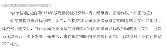 第三次補(bǔ)正,商標(biāo)局要求我們提供其隸屬企業(yè)蓋章簽字的同意轉(zhuǎn)讓文件并附其主體資格證明文件,并由隸屬企業(yè)所屬的管理單位出具明確該商標(biāo)權(quán)歸屬的相關(guān)文件