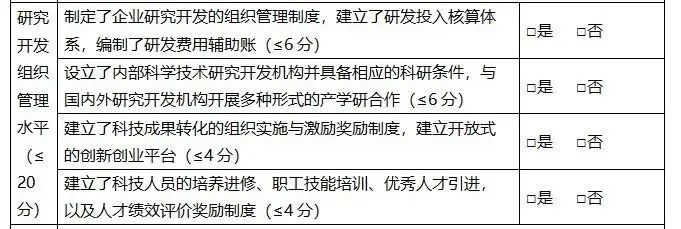 由技術專家根據(jù)企業(yè)研究開發(fā)與技術創(chuàng)新組織管理的總體情況,結合以下幾項評價,進行綜合打分。