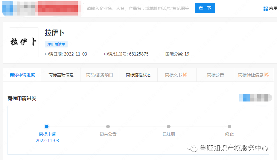 網(wǎng)上信息顯示,"拉伊卜"商標(biāo)在11月初被自然人王某某申請(qǐng)注冊(cè),相關(guān)注冊(cè)申請(qǐng)的國(guó)際分類為19類建筑材料,申請(qǐng)/注冊(cè)號(hào)為68125875,商標(biāo)類型為普通商標(biāo),目前商標(biāo)狀態(tài)顯示為"注冊(cè)申請(qǐng)中"。
