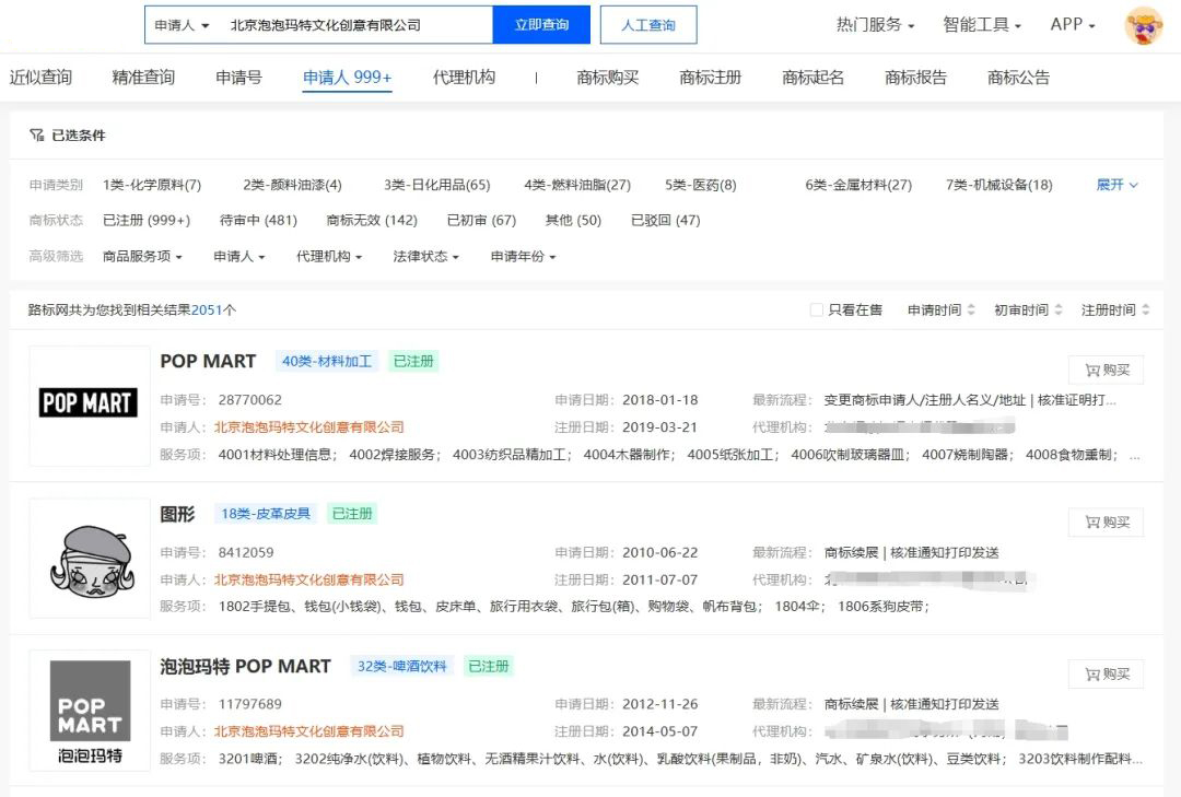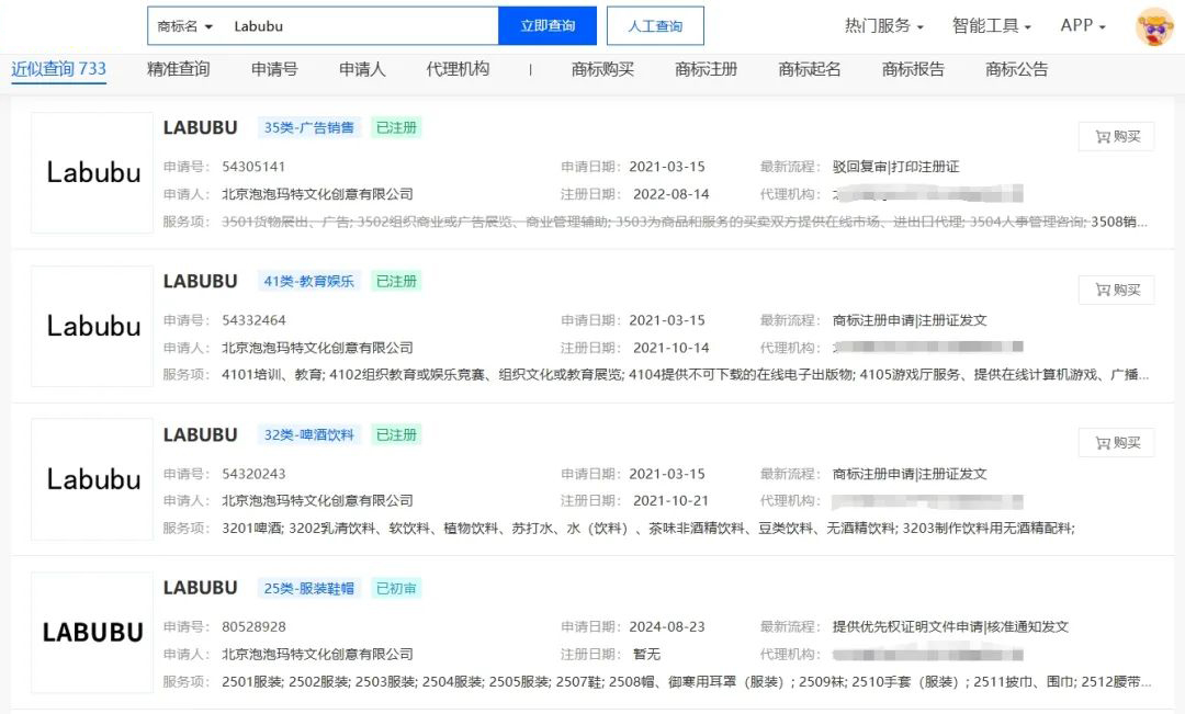 據(jù)路標(biāo)網(wǎng)查詢顯示,泡泡瑪特公司在國內(nèi)申請(qǐng)了2000+件商標(biāo),其中與 Labubu 相關(guān)的商標(biāo)涵蓋多個(gè)類別。