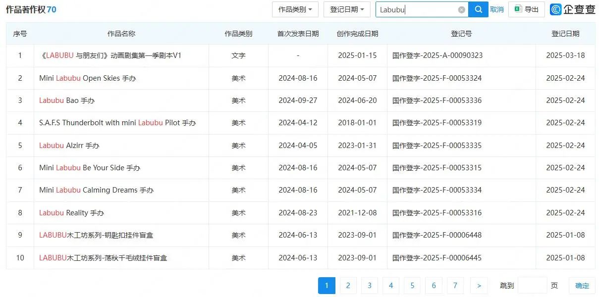 Labubu系列作品登記數(shù)量超過 70 件,涵蓋了 Labubu 的各種形象設(shè)計(jì)、動(dòng)畫劇集等方面 。通過版權(quán)登記,泡泡瑪特明確了Labubu系列作品的權(quán)屬,確保了 Labubu的創(chuàng)意成果受到法律的嚴(yán)格保護(hù),任何未經(jīng)授權(quán)的復(fù)制、傳播和使用都將構(gòu)成侵權(quán)行為。