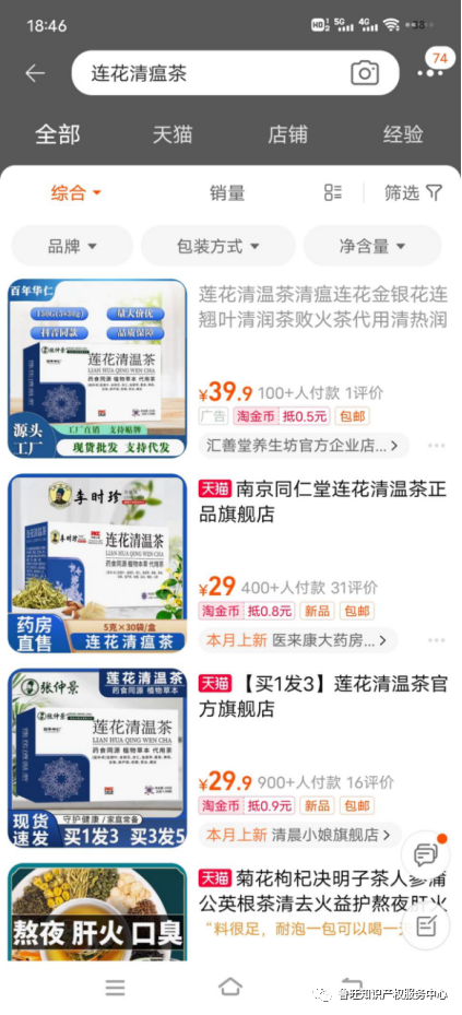 在淘寶平臺(tái)搜索發(fā)現(xiàn),有眾多“連花清溫茶”在售,且大部分產(chǎn)品的外包裝神似以嶺藥業(yè)的連花清瘟。月銷量最好的“連花清溫茶”售出超過200件,品牌顯示為李時(shí)珍華真源。按49元的平均價(jià)格粗略計(jì)算,該產(chǎn)品月銷售額超9800元。同樣,該產(chǎn)品為代用茶,也就是食品。